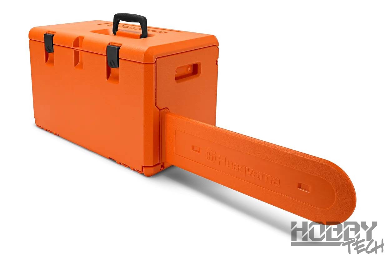 Pevný, účelný box pro uložení a přenášení řetězové pily, mazacích olejů a dalšího příslušenství.
