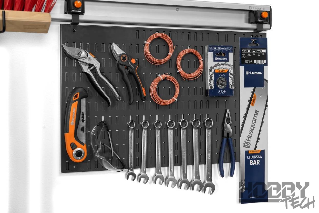 Deska na nářadí Husqvarna je navržena tak, abyste nářadí měli vždy po ruce a přehledně uspořádané. Děrovanou desku si můžete snadno přizpůsobit. Ohnutím požadovaných kusů plechu vytvoříte háčky na míru vašemu nářadí. Děrované desky lze kombinovat podle potřeby, a dokonale je tak přizpůsobit vašemu prostoru a požadavkům na skladování. Celkem můžete na desce vytvořit více než 250 háčků.