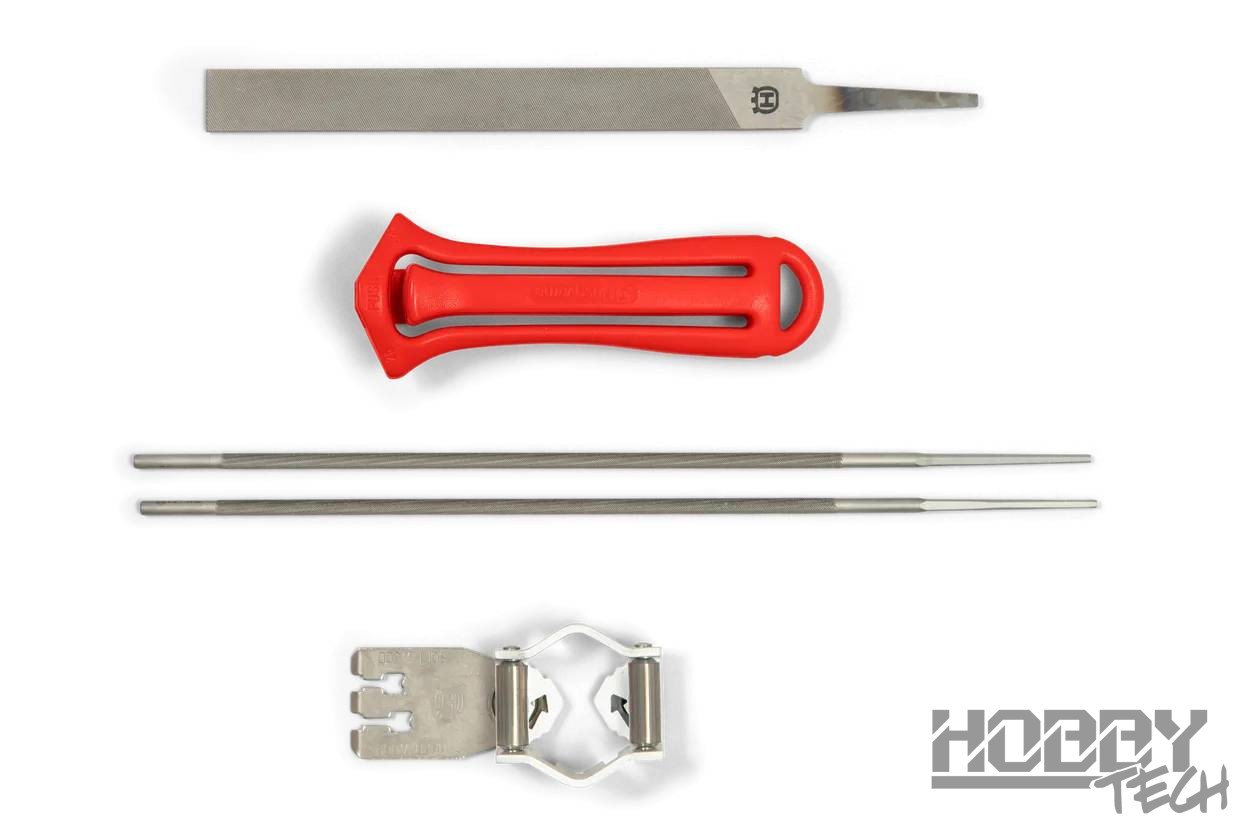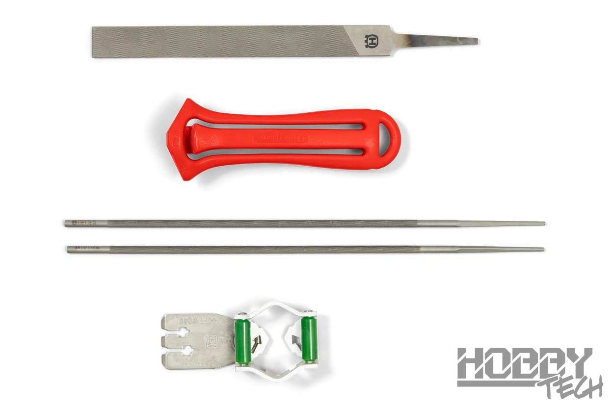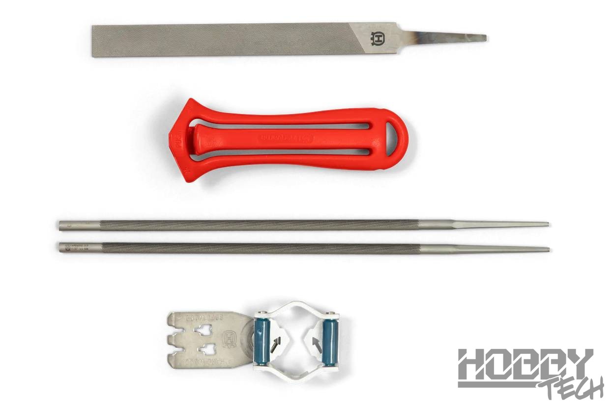 Kompletní sada na ostření řetězů pro snadné udržování stále nabroušeného řetězu. Se správně nabroušeným řetězem bude vaše práce snadnější a bezpečnější. Sada obsahuje rukojeť pilníku, kombinované vodítko nebo vodítko pro ostření a měrku pro snížení omezovacího zubu, dva kulaté pilníky a jeden plochý pilník.