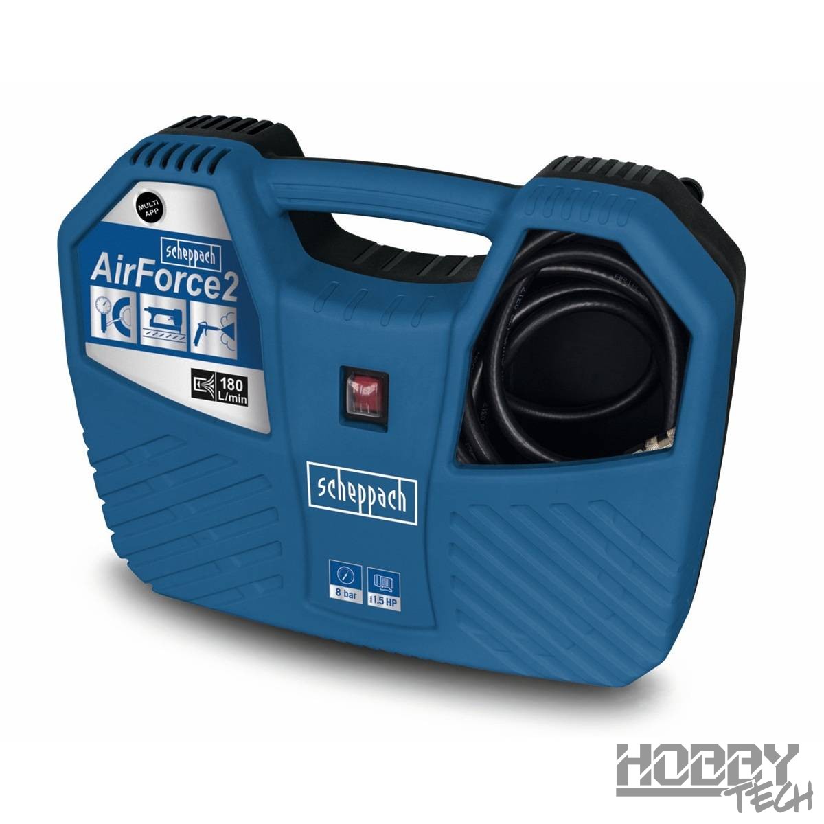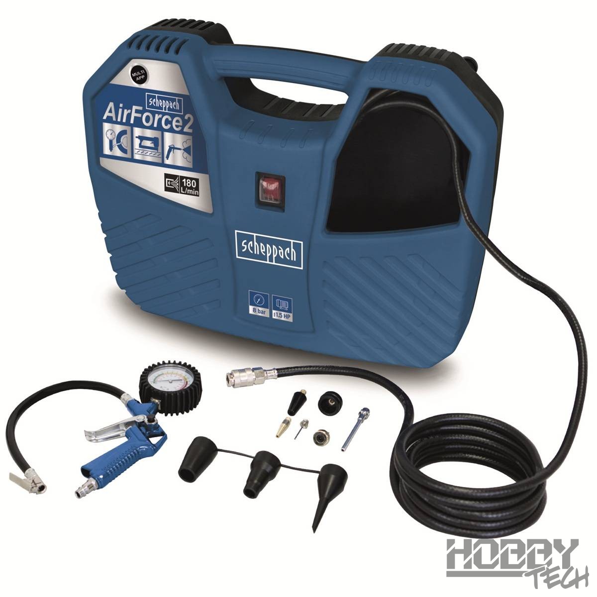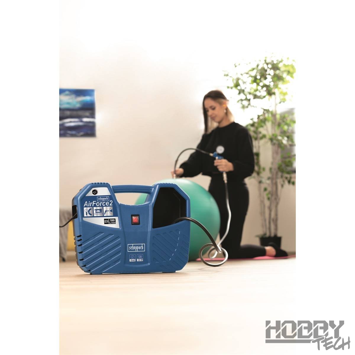 Kompresor Scheppach AIR FORCE 2 je praktický, skladný, lehký, výkonný a bohatě vybavený pomocník vhodný do každé domácnosti, chaty, karavanu nebo lodě. Díky velkému množství různých koncovek, silnému motoru a vysokému pracovnímu tlaku si hravě poradí s foukáním pneumatik motocyklů, kol, aut, terénních čtyřkolek, míčů, matrací, nafukovacích člunů, raftů apod. Veškeré příslušenství, včetně elektrického kabelu, 3 m tlakové hadice, pistole s manometrem a devíti různých koncovek je chytře ukryto uvnitř kompresoru, takže se Vám nic neztratí. Pohodlné madlo usnadní přenášení. Kompresor je vybavený nejmodernějším motorem s bezolejovou technologií. Kontrola oleje, jeho doplňování nebo výměna tak vůbec není potřeba a kompresor je vždy připravený odvést svoji práci. Jeho rozměry a váha pouhých 5,5 kg ho rovněž předurčují k využití při stanování, kempování a jiných outdoorových aktivitách.