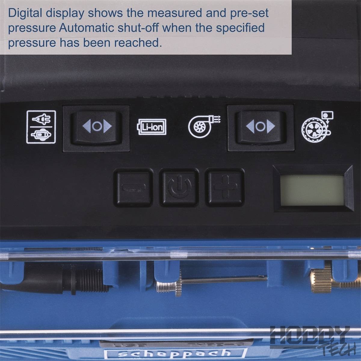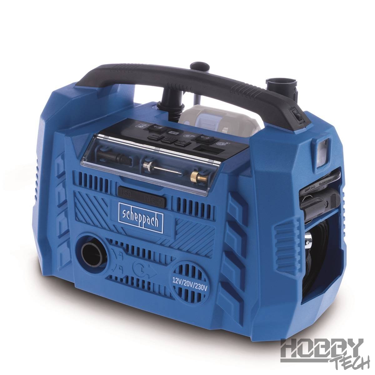 Tento hybridní kompresor podporuje napájení z baterie řady Scheppach IXES 20V, standardní elektrické sítě (230 V) nebo autozapalovače (12 V). S pracovním tlakem až 10,3 bar zvládne i náročnější úkoly, přičemž jednoduché ovládání zajišťuje přehledný digitální panel. Díky funkci automatického vypnutí se kompresor vypne, jakmile dosáhne přednastaveného tlaku, což zajišťuje bezpečnost a komfort obsluhy. Možnost volby jednotek tlaku (bar, PSI, kPa) zvyšuje jeho univerzálnost. Praktické funkce zahrnují režim vysokého objemu a nízkého tlaku, ideální například pro rychlé nafukování matrací nebo vyfukování vzduchu při balení.