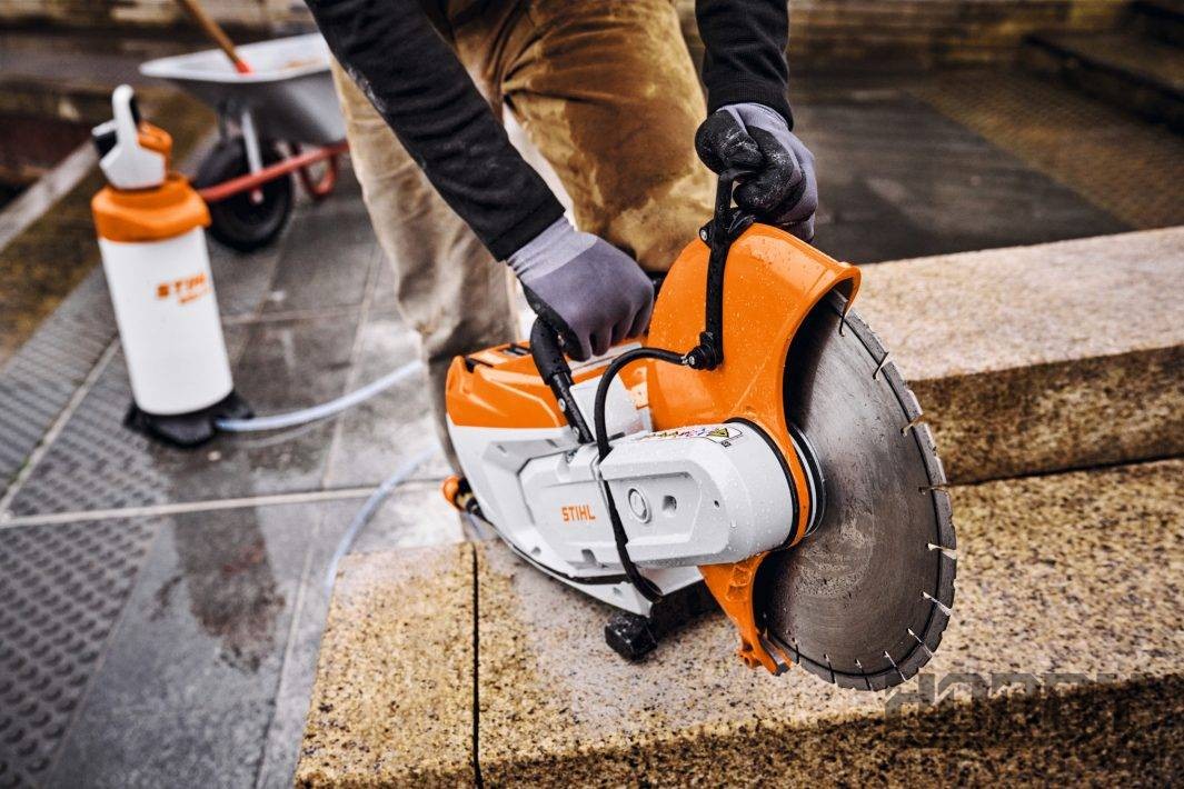 Pro vázání prachu a chlazení. Při práci se strojem je k dispozici trvalý přívod vody k proplachování řezného kotouče. Slouží k vázání prachu a chlazení v řezu. Díky přívodu vody přímo na zařízení je toto oplachování jednoduché a trvale zabezpečené.